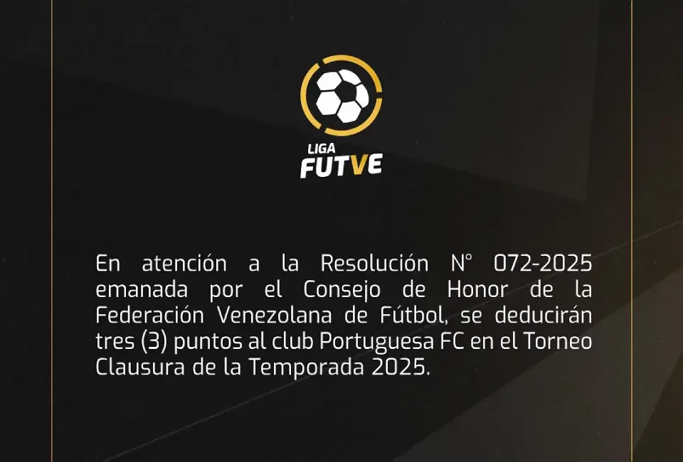 La Liga FUTVE informó este viernes que el Portuguesa FC ha sido sancionado con la reducción de tres puntos, según la resolución N° 072-2025 emitida por el Consejo de Honor de la Federación Venezolana de Fútbol. Esta sanción será aplicada de forma inmediata, afectando el inicio del Torneo Clausura para el equipo conocido como el «Penta».