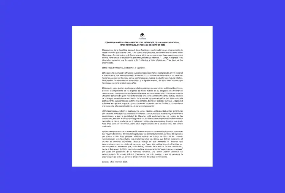 La organización no gubernamental Foro Penal rechazó las declaraciones del presidente de la Asamblea Nacional, Jorge Rodríguez, emitidas el 13 de enero de 2026 en el parlamento, en las que afirmó que la ONG cobra dinero a personas privadas de libertad por la tramitación de sus liberaciones y calificó ese proceder como “artero”, “mezquino” y “una basura”. Foro Penal negó que exija pagos por su asistencia legal y sostuvo que su labor ha sido gratuita desde su fundación.