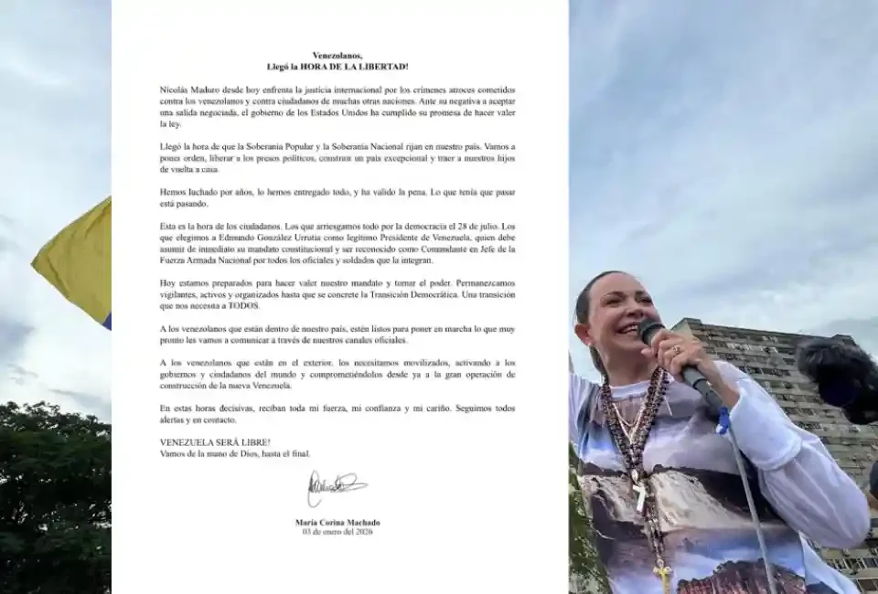 Machado señaló que, tras la captura de Maduro, se abre una etapa en la que deben prevalecer la soberanía popular y la soberanía nacional. “Llegó la hora de que la Soberanía Popular y la Soberanía Nacional rijan en nuestro país. Vamos a poner orden, liberar a los presos políticos, construir un país excepcional y traer nuestros hijos de vuelta a casa”, afirmó en su mensaje, acompañado del texto “Venezolanos, llegó la hora de la libertad”.