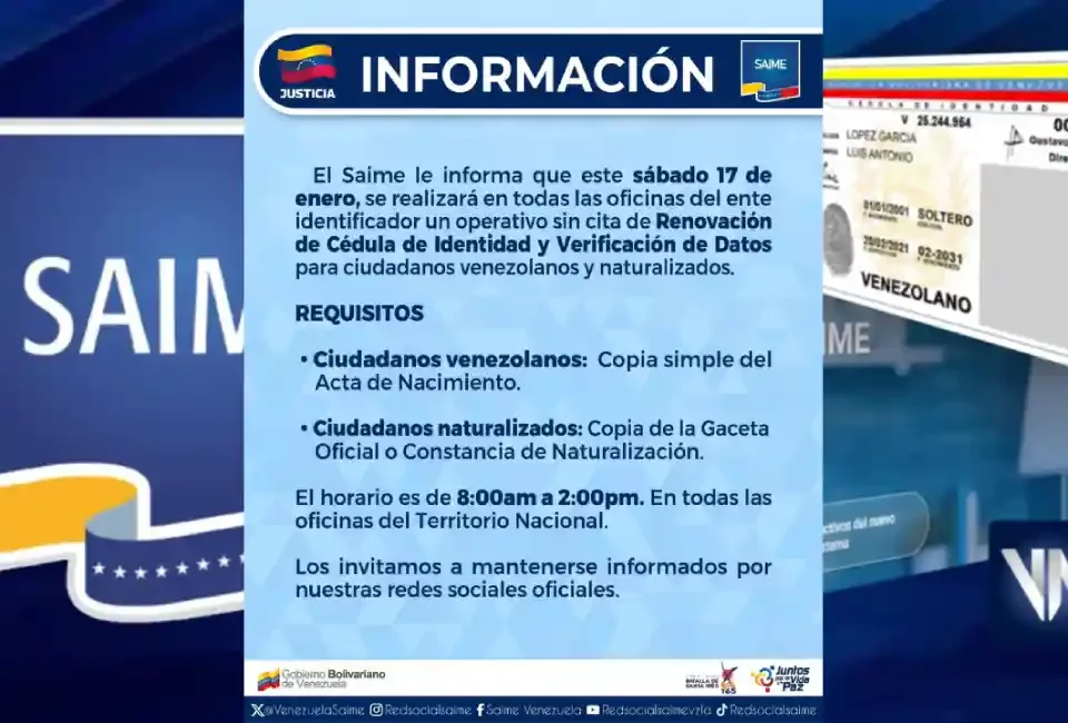 El Servicio Administrativo de Identificación, Migración y Extranjería (Saime) informó que este sábado 17 de enero llevará a cabo una jornada sin cita de cedulación y verificación de datos en todas sus oficinas a nivel nacional, dirigida a ciudadanos venezolanos y personas naturalizadas, en un horario comprendido entre las 8:00 am y las 2:00 pm.