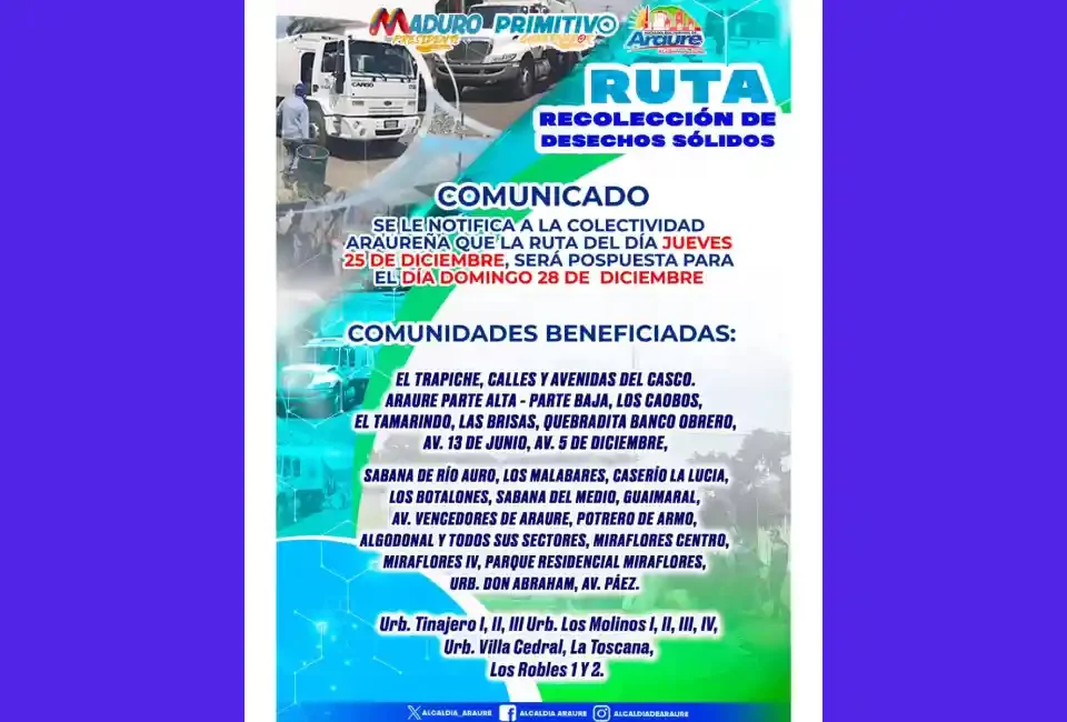 La Alcaldía de Araure informó a la colectividad que la ruta de recolección de desechos sólidos correspondiente al día jueves 25 de diciembre será pospuesta y se ejecutará el domingo 28 de diciembre.