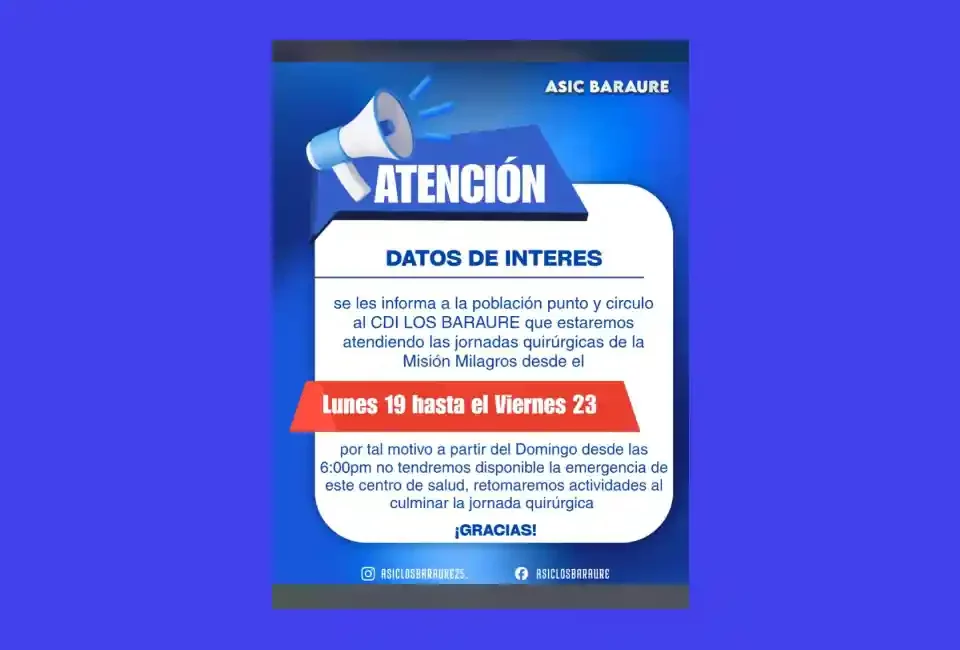 El CDI Los Baraures señaló que las actividades regulares se retomarán una vez que culmine la jornada quirúrgica prevista en el marco de la Misión Milagro. La información fue dirigida a la población del denominado punto y círculo del CDI Los Baraures.
